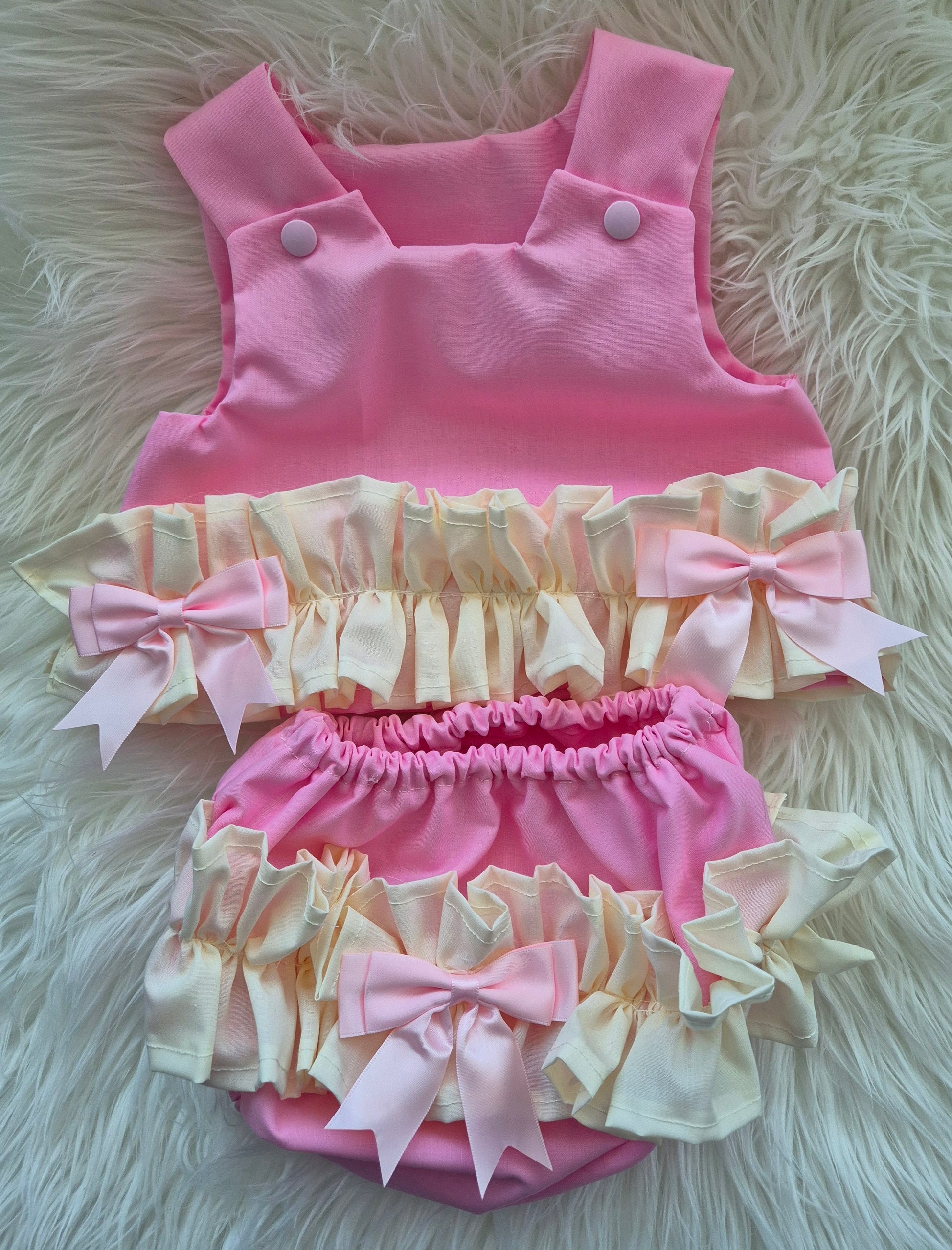 Pink Jam pants with Cream Ruffle frill and Pink satin bow