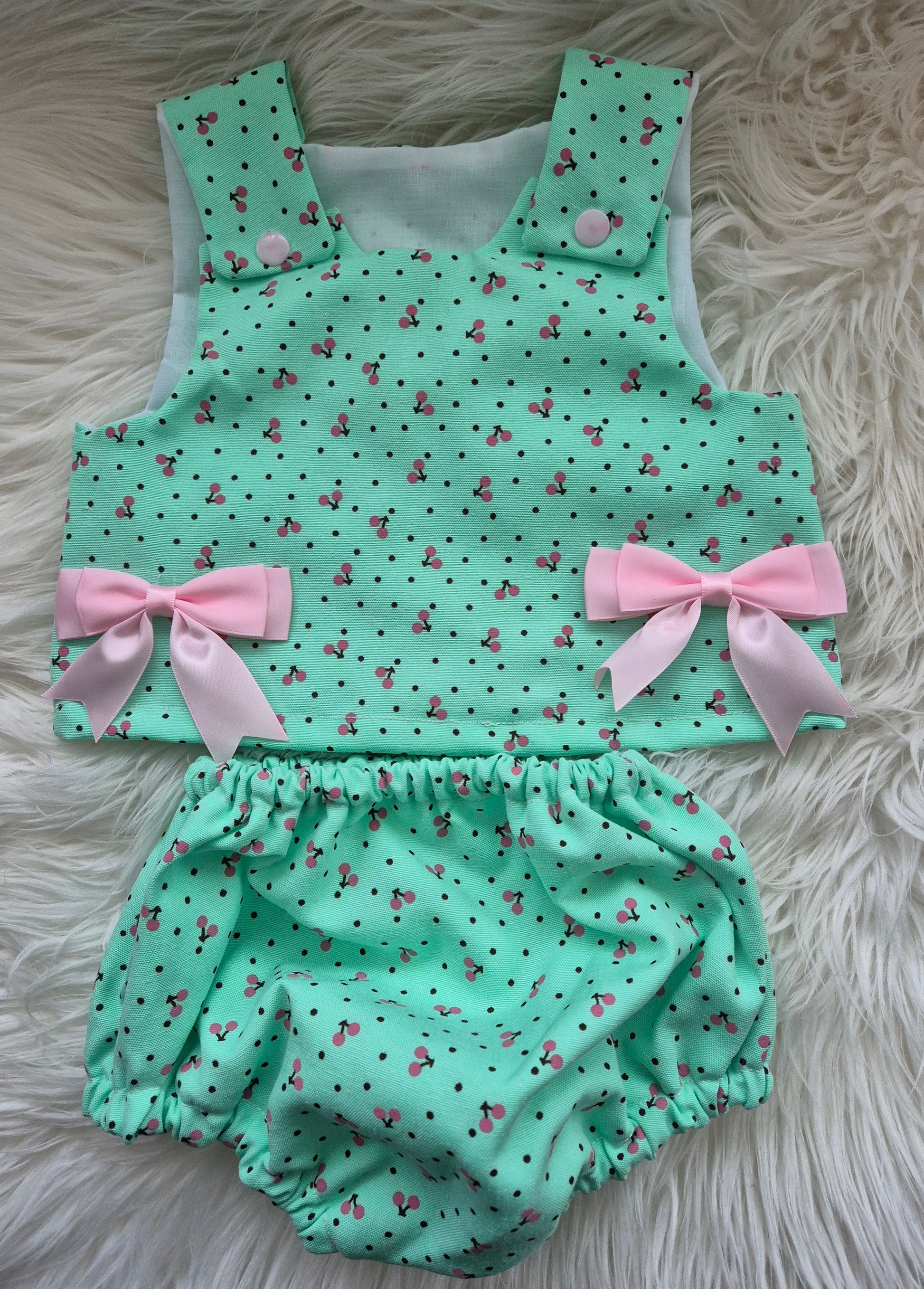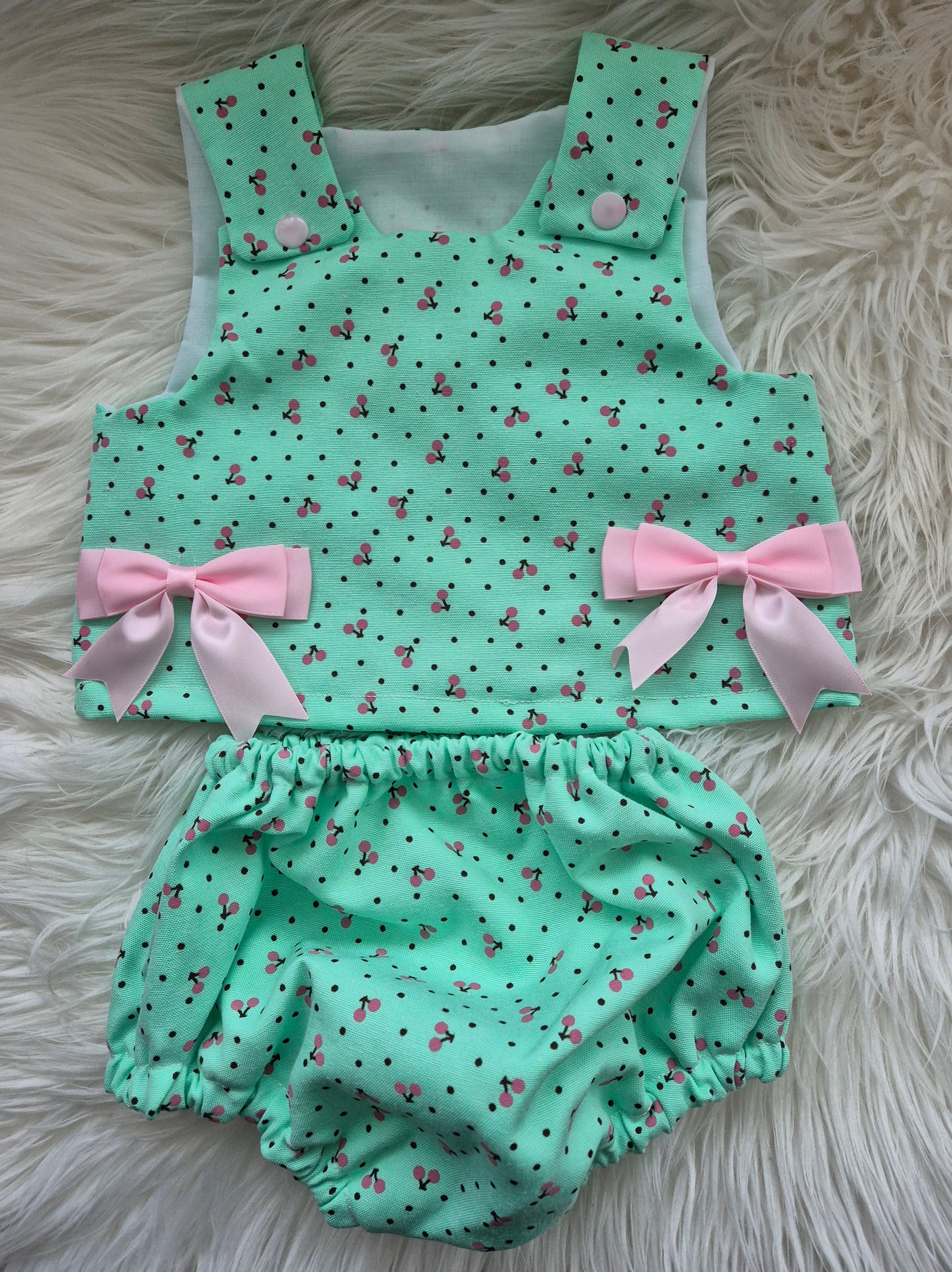 Green with Pink flower fabric jam pants and Angel top set set fully lined with Pink bows