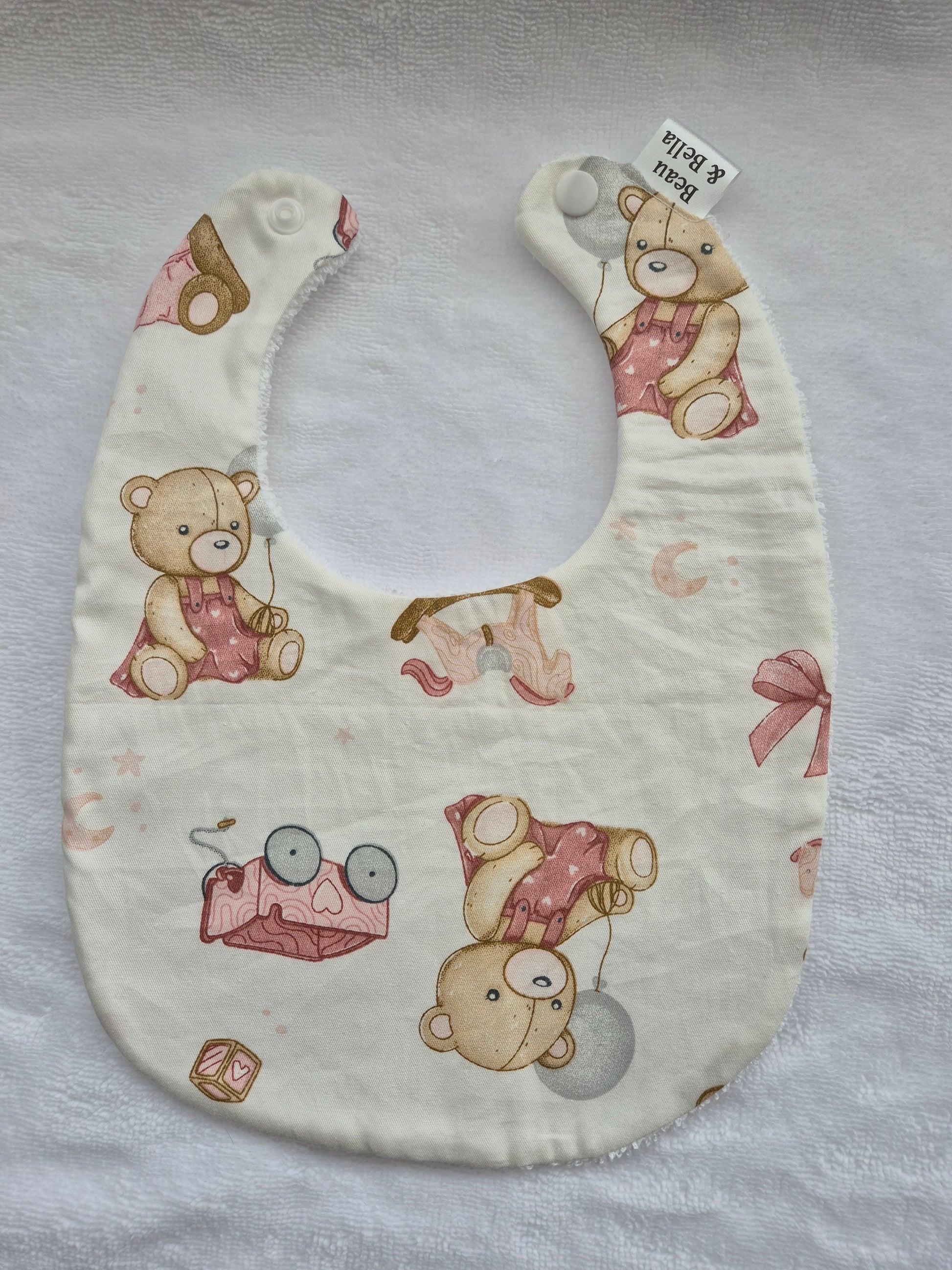 Pink Teddy soft cotton bib with Ivory background backed with soft absorbant towelling